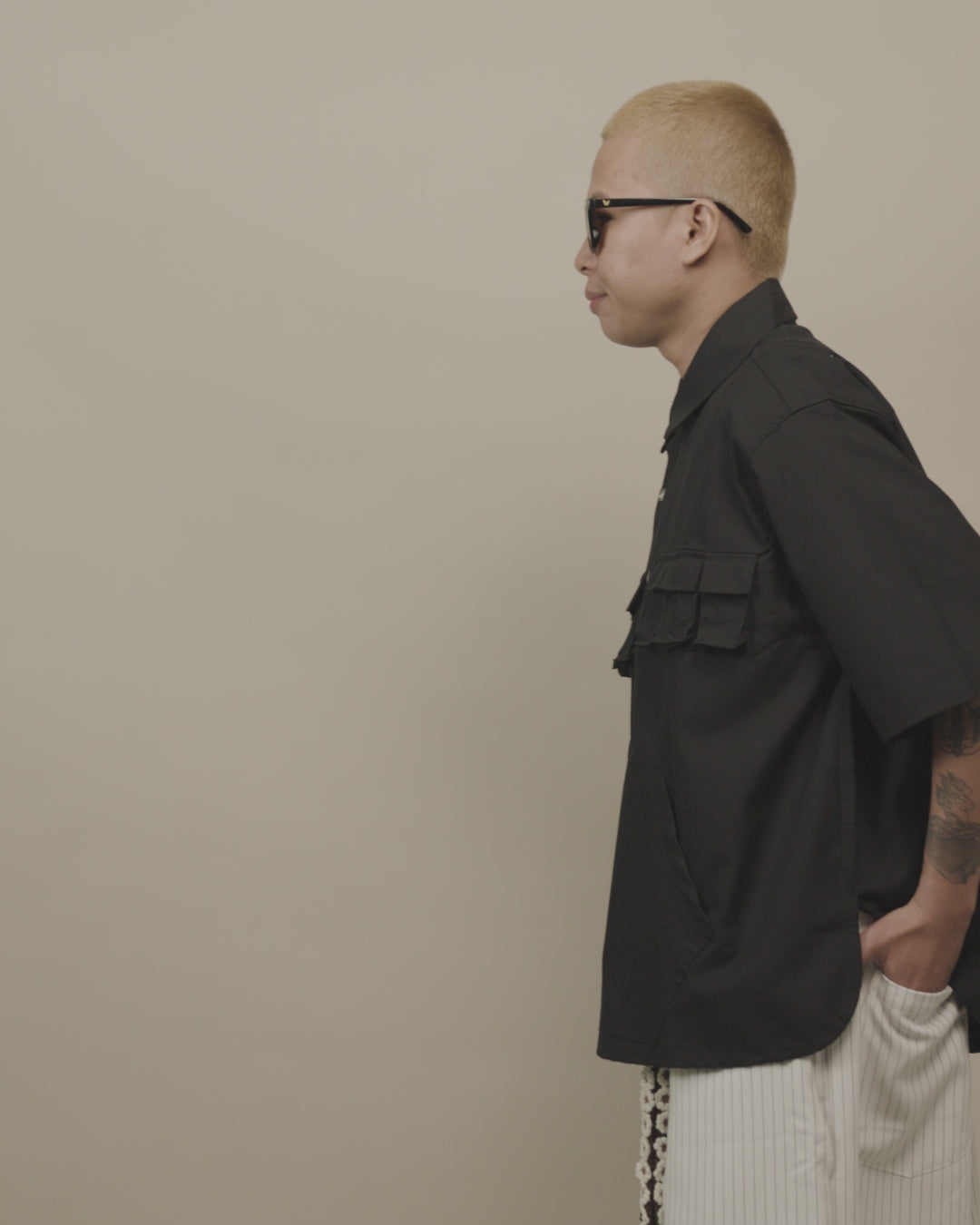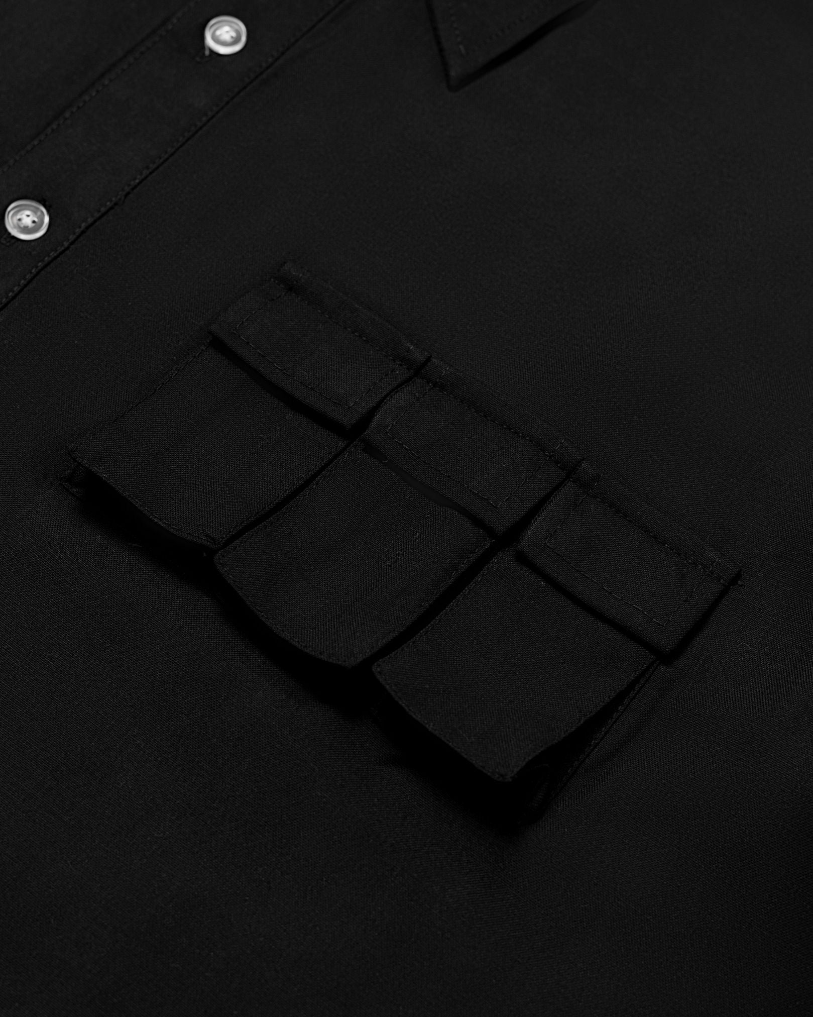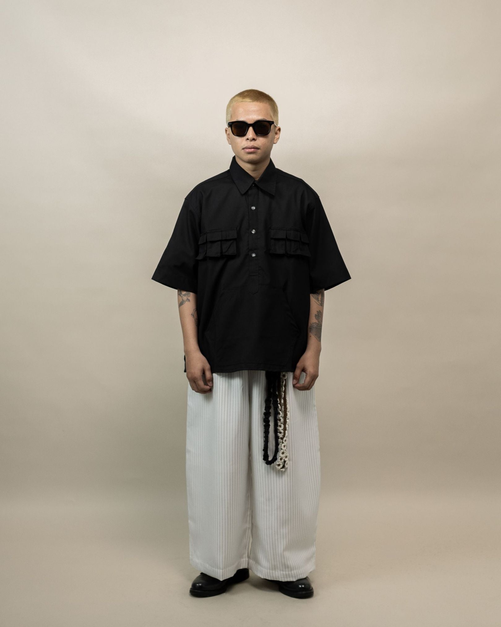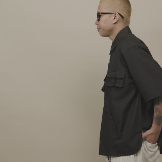 The Kangaroo Shirt Black is a versatile everyday essential designed for daily rotation, perfect for warm-weather wear and effortless layering. Cut in OAT’s oversized fit with a straight point collar and quarter buttons, it offers a relaxed silhouette with intentional proportions. Made from breathable tropical polycotton, it feels light and comfortable all day. Mini flap pockets at the top and an oversized “Kangaroo” pocket at the lower front add functional detail—perfect for casual days and easy off-duty styling.