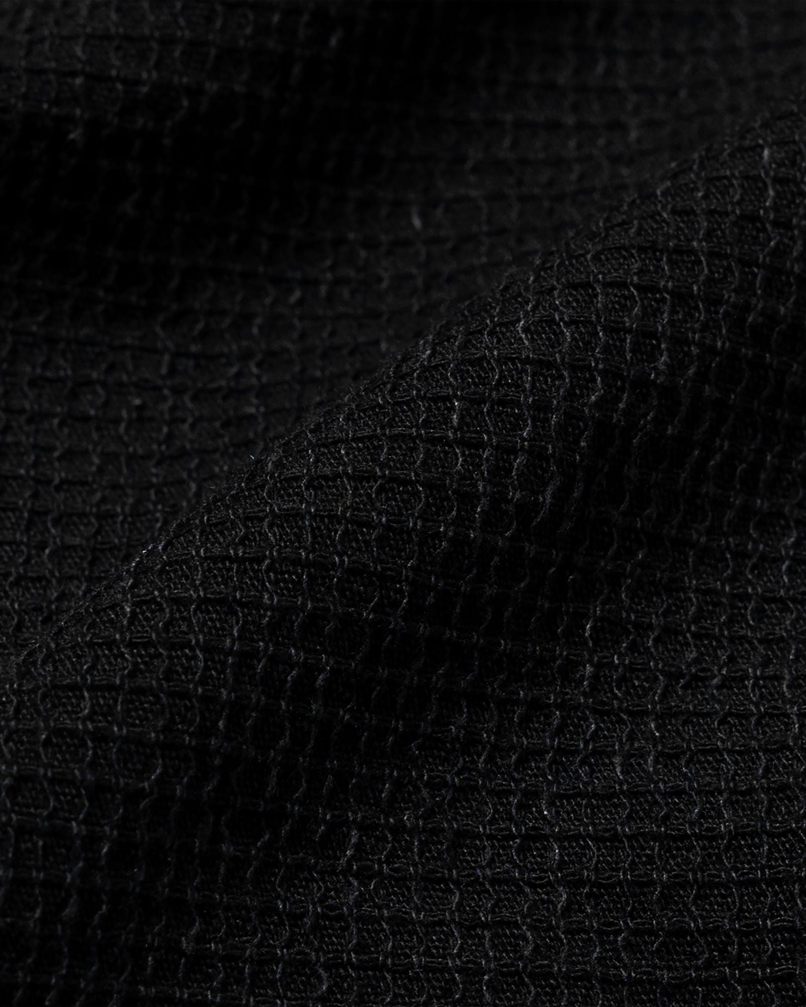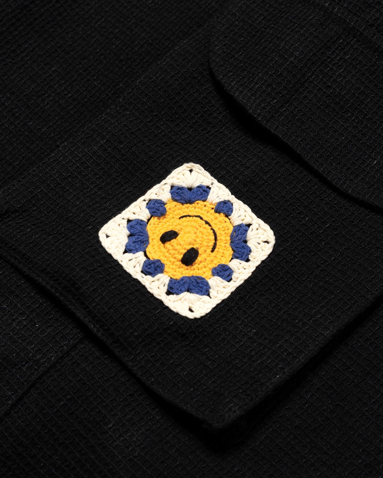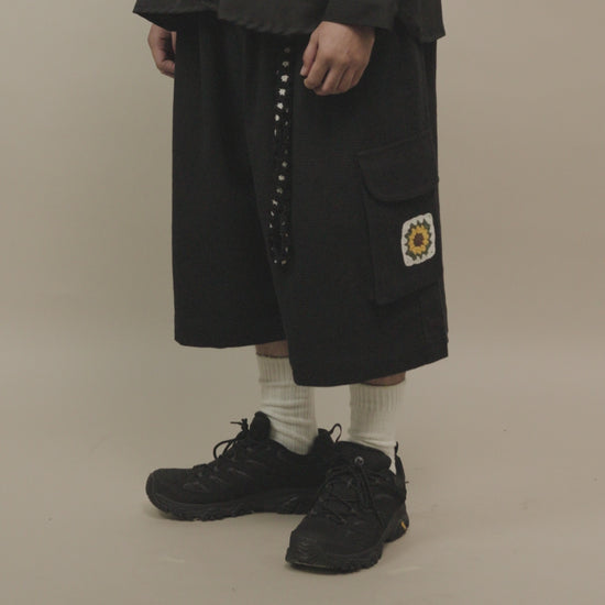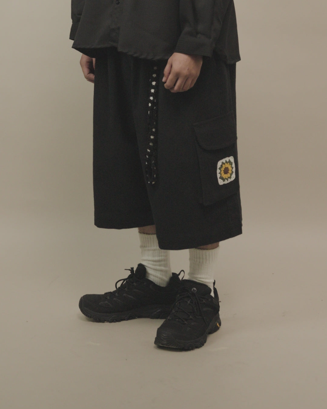 Cargo Shorts Black are designed for utility-forward everyday wear, perfect for warm-weather days and effortless daily rotation. Cut in OAT’s oversized fit with a stretch rubber waistband and belt loops, they offer a relaxed silhouette with all-day comfort. Made from cotton Sashi-ori 12 oz, the fabric brings structure and durability. Functional details include two seamed pockets and two classic cargo pockets, with OAT signature smile logo and sunflower square crochet detailing adding crafted character. Finished with a locker loop—perfect for versatile styling where comfort and purposeful design matter.