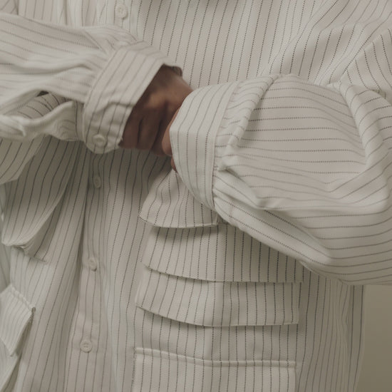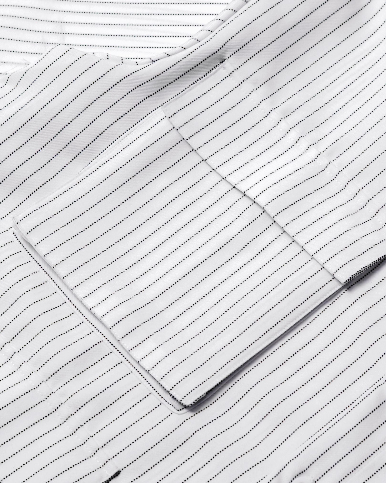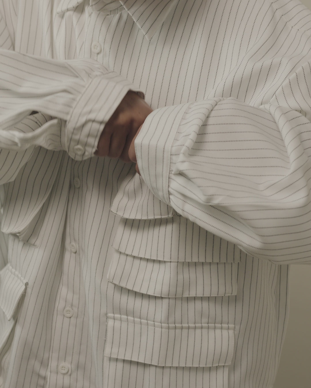 The Lepa Shirt L/S Semi Wool Stripes White is a versatile layering piece designed for daily rotation, perfect for elevated casual wear and transitional styling. Cut in OAT’s boxy oversized fit, it offers a relaxed silhouette with structure from the straight point collar with back button and half-moon back yoke. Made from semi-wool, the fabric delivers balanced warmth with a refined feel. Front utility pockets, barrel cuffs, and side slit openings add practical detail, finished with a locker loop—perfect for wearing on its own or layered with quiet, thoughtful character.