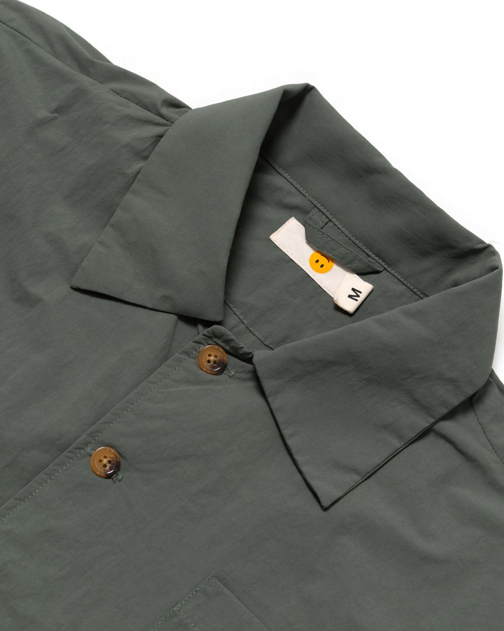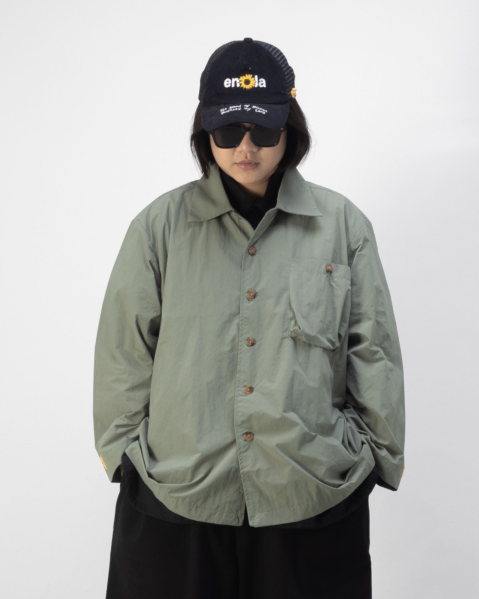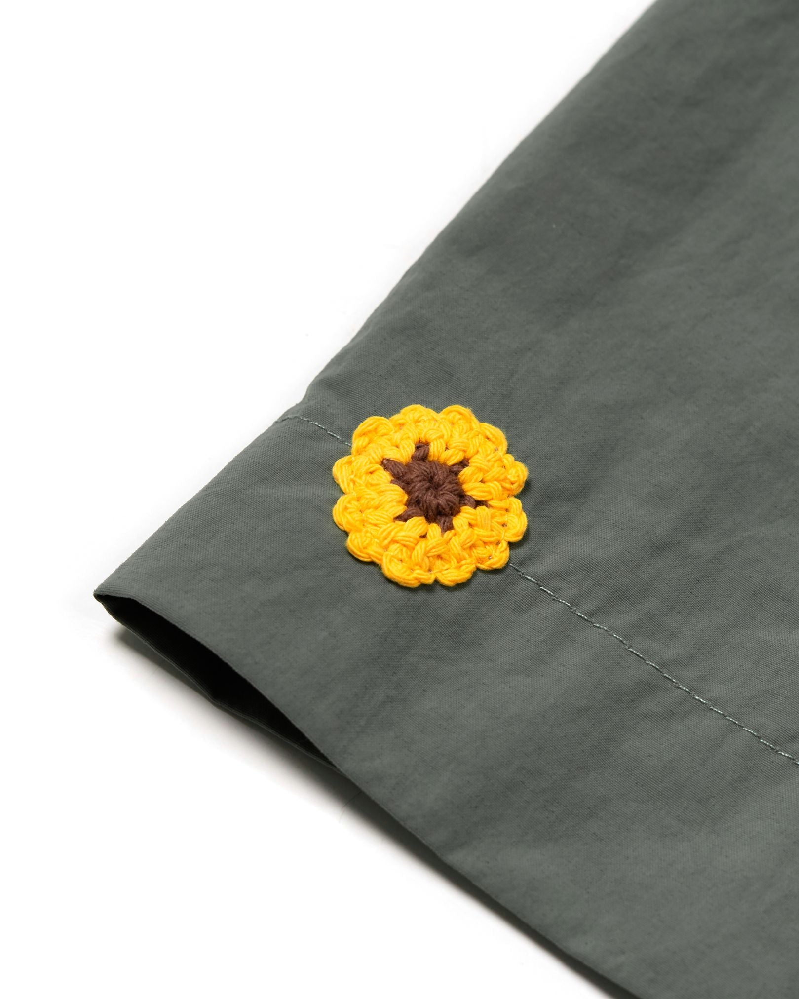 The Saba Overshirt Gray/Green is a lightweight, breathable everyday layer designed for daily rotation, perfect for relaxed casual wear and easy styling. Cut in OAT’s boxy oversized fit with a straight point collar and half-moon back yoke, it offers a relaxed silhouette with subtle structure. Made from polyamide, the fabric feels airy and dependable for all-day comfort. Functional details include a chest pocket with button closure and yellow 3D OAT ‘Sunflower’ crochet embroidery on both lower sleeves—perfect for adding quiet crafted character to everyday outfits.