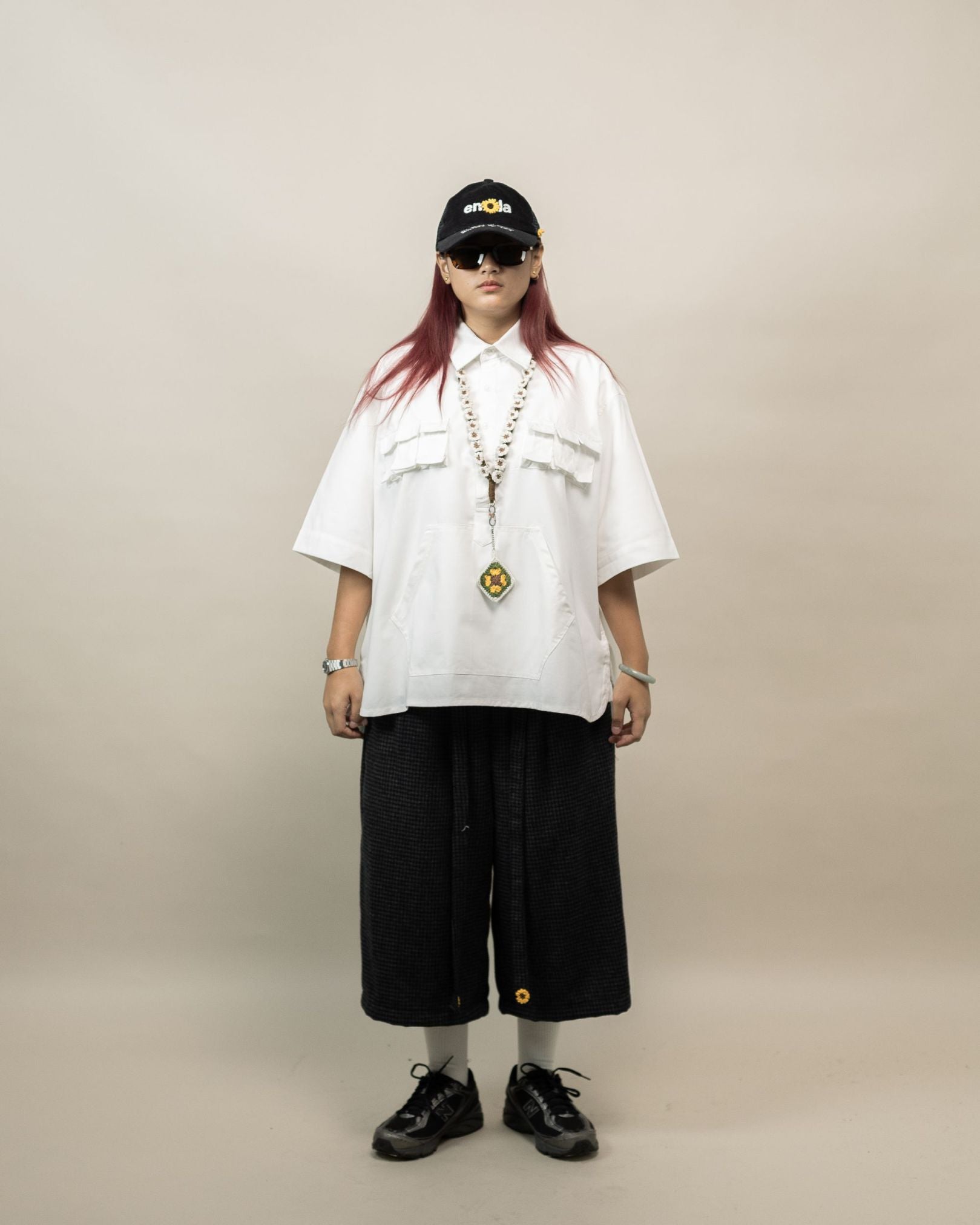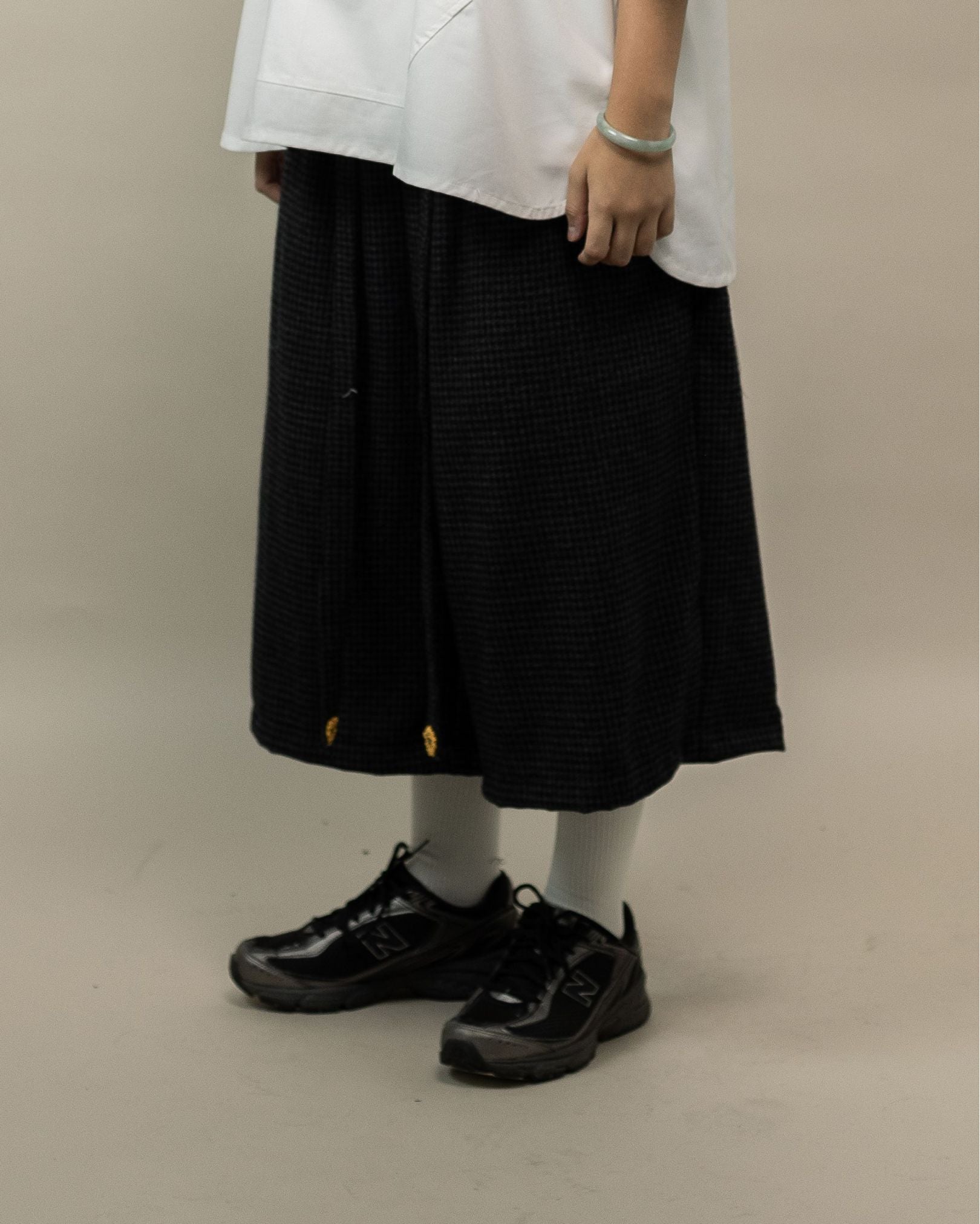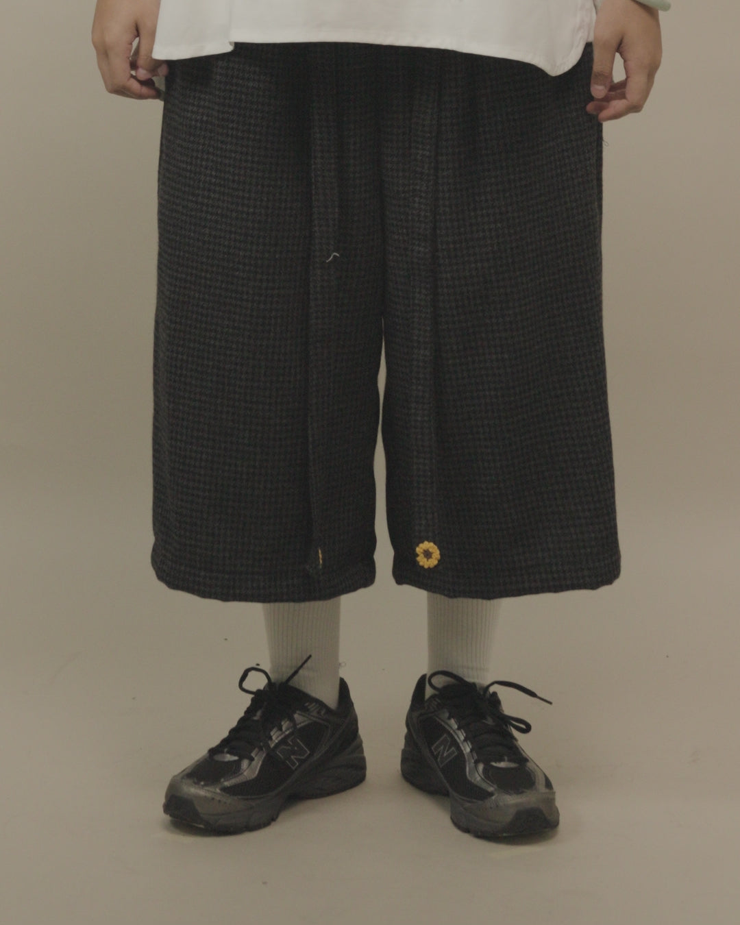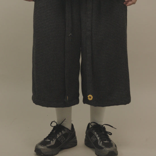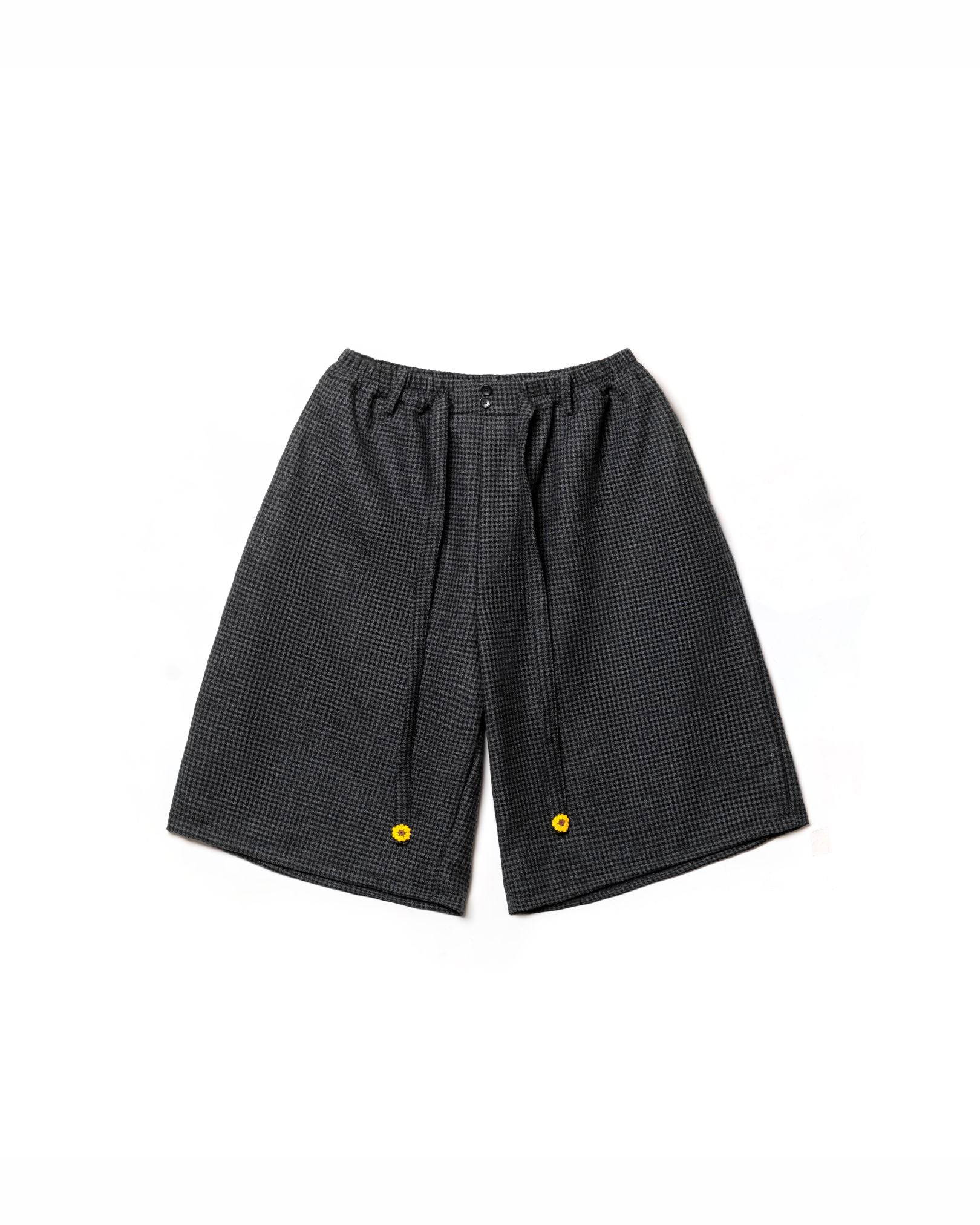 The Tororu Shorts Semi-Wool Pattern Gray are designed for relaxed everyday wear, perfect for transitional weather and effortless daily rotation. Cut in a loose straight fit with a stretch rubber waistband, they offer all-day comfort with balanced proportions. Made from semi-wool, the fabric delivers soft warmth with dependable structure. Functional seamed pockets and a Hakama Himo waist strap detail add purposeful utility, while yellow 3D OAT ‘Sunflower’ crochet embroidery on the Hakama Himo brings a signature crafted touch. Finished with a locker loop—perfect for laid-back styling with thoughtful detail.